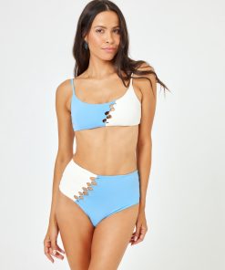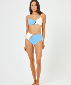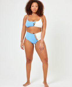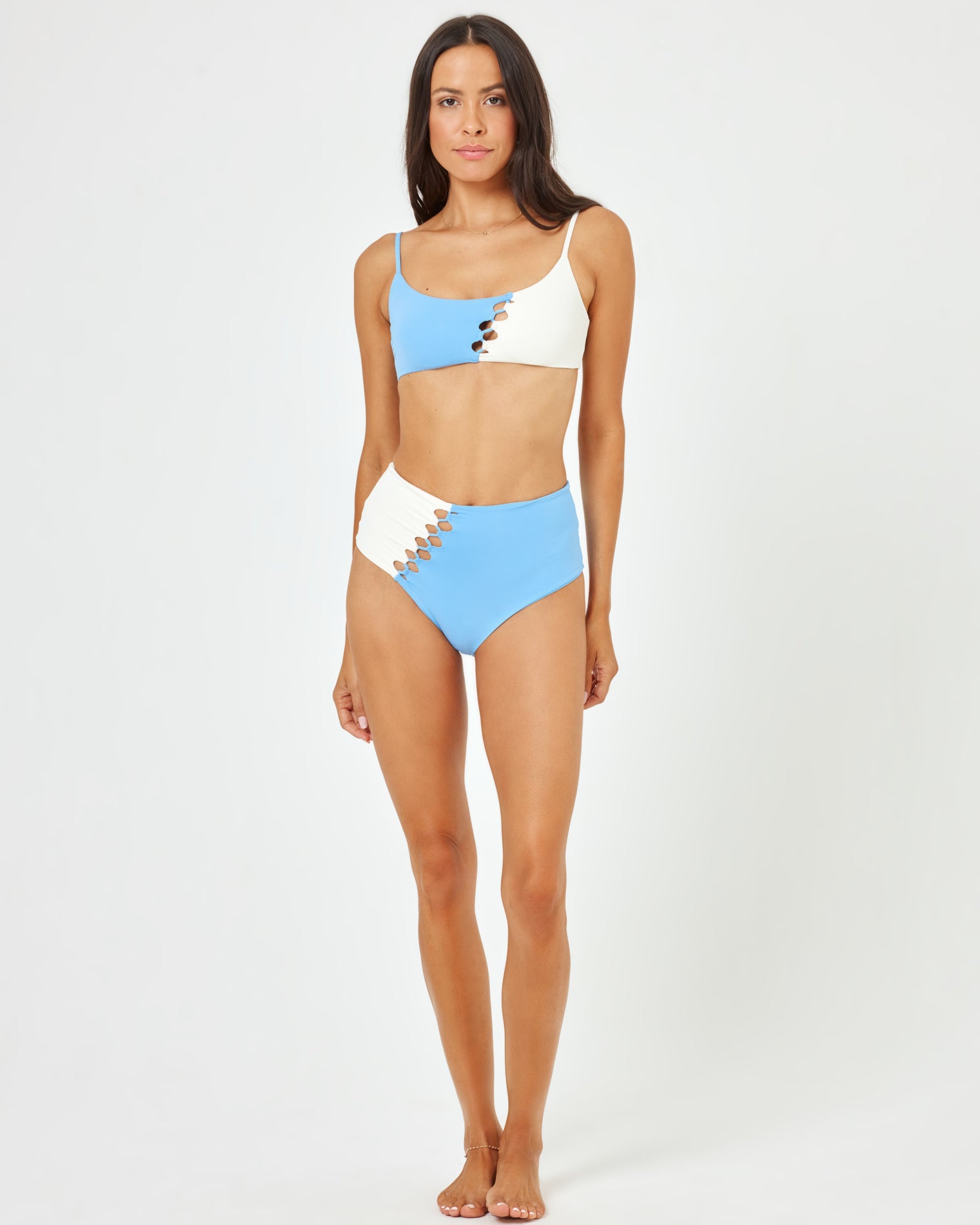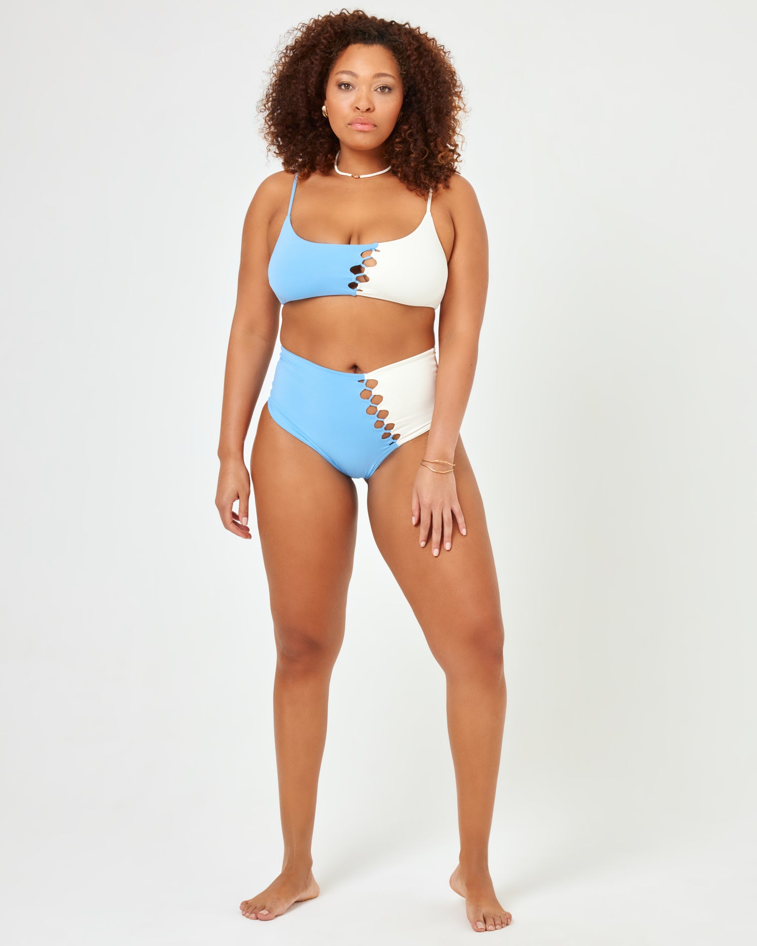 Have some fun chasing the sun in our Solstice Bikini Top. This color blocking bralette is all about the details with ladder seams that combine the aura + cream colors. Bralette Top Ladder Colorblock Detail Adjustable straps Size XS-XL Fabric Content: 97%Nylon, 3%Spandex Like all delicates, shape, color and fit are best preserved if hand washed in cold water. Lay flat to dry. Style # CBSOT23