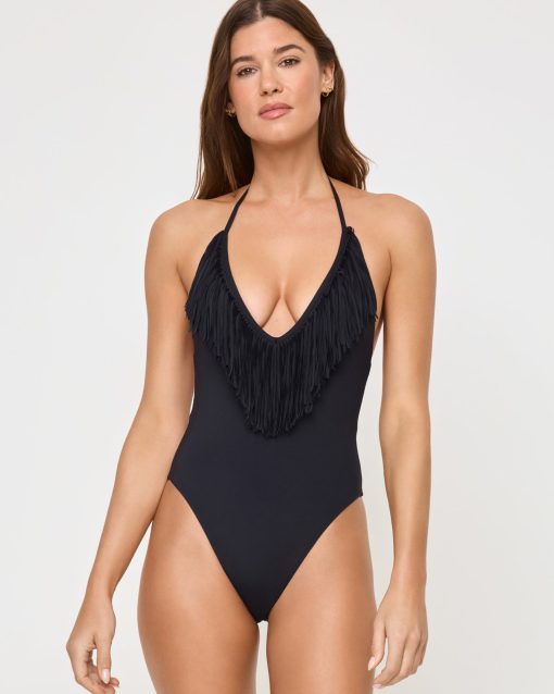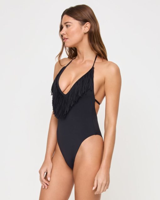 Guess who’s back, back again?! Fringe is back, tell a friend. The Desert Days One Piece brings our iconic fringe to the forefront of your next swim look. Featuring classic coverage, a super-deep v-front and ties at the neck and back — there’s no doubt you will feel your best when rockin’ this one. Bonus points — she doubles as a bodysuit when paired with denim.Deep V Tie at neck Tie at back Classic coverage Fringe at bust Classic Coverage Size XS-XL 82% Nylon, 18% Spandex Style # LSDEMC25