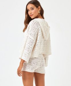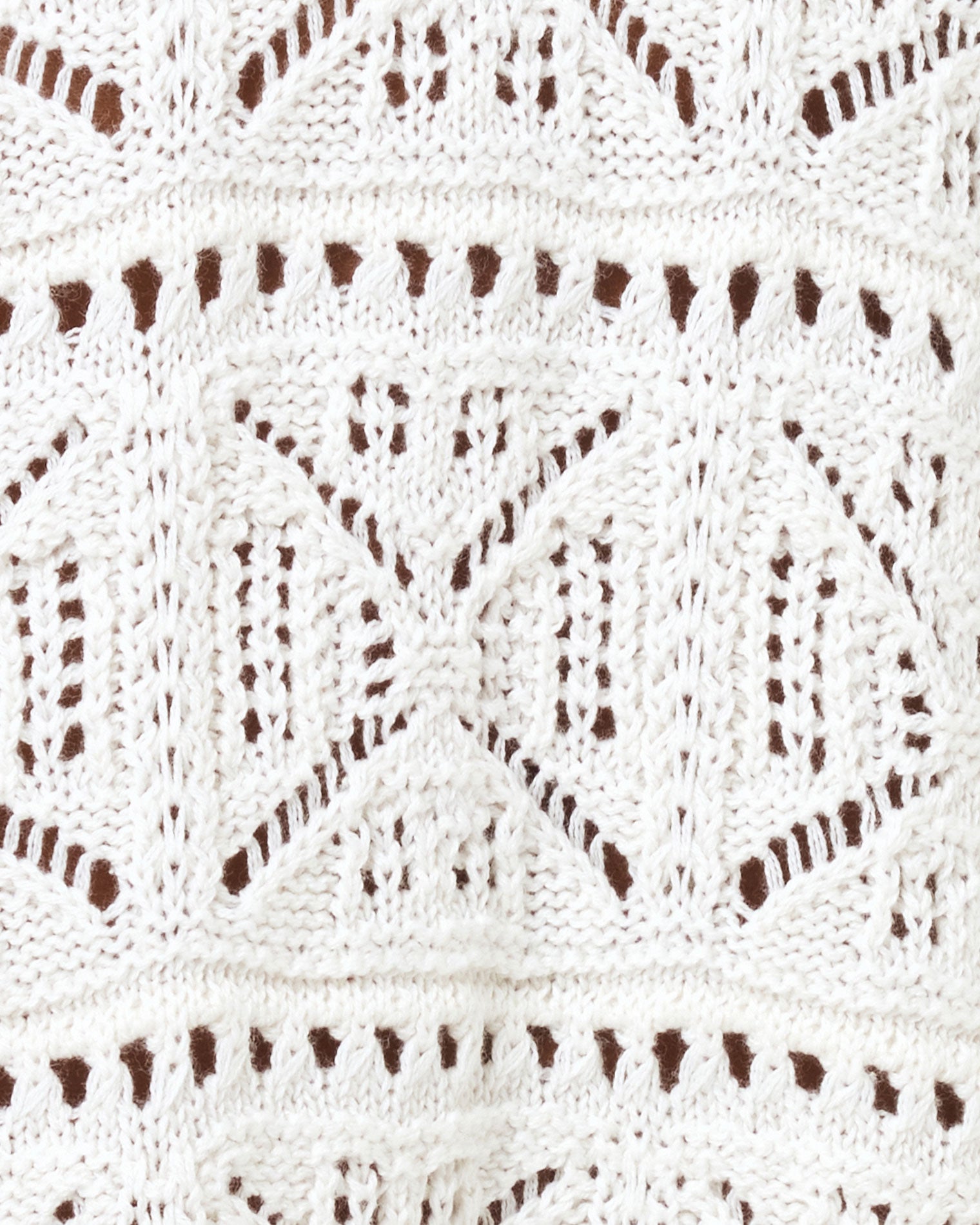 With a high-waist + crochet fabric, the Diamond Eyes Shorts are an effortless pick for any season. Wear these with the coordinating sweater or throw them over a bikini for a beach day. Short High Waist Ribbed Waistband Diamond Eye Crochet Fabric 100% Cotton Size XS-XL Like all delicates, shape, color and fit are best preserved if hand washed in cold water. Lay flat to dry. Style # DEYSH24