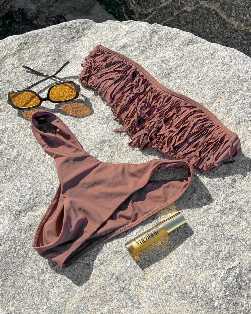 The Dixie Top is a strapless bandeau bringing sexy back thanks to its nostalgic fringe at the bust. You’ll be able to shimmy and shake in this iconic bikini that features removable pads and back tie. Bandeau Top Tie at back Fringe at bust Removable Padding Size XS-XL 82% Polyester | 18% Spandex Style # LSDIT25