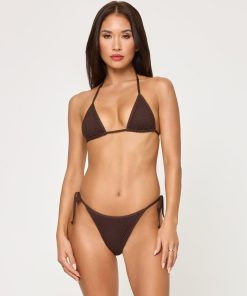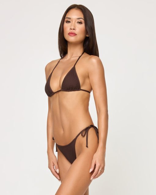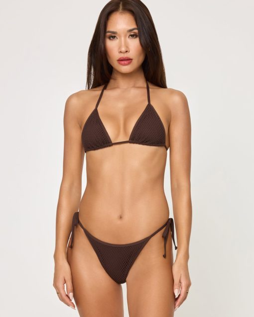 Get tied up in the Levy Bikini Bottom. Bitsy coverage and fun little side ties combine with our rich new espresso-inspired fabric for a fresh take on a signature fit. “Bitsy coverage Mid rise High leg Tie side Crochet net overlay 100% Cotton Style # CMLEB25