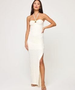 It’s totally okay to kiss and tell when you’re wearing our pucker up knit dress. The Lucca Dress is as unique as it is memorable all due to the gorgeous fabrication and thoughtful details. A halter neck with front keyhole, wood beading and a high side-slit combine to make this ankle-length number perfect for your next event, vacation or anything in between.Halter neck Keyhole in front Wood beading Ankle length Slit on side Pucker up knit 60% Cotton 37% Nylon 3% Spandex