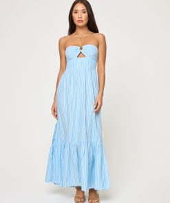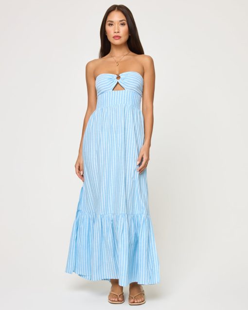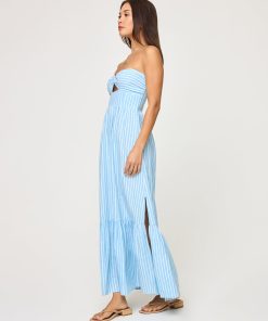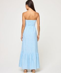Crafted from a soft, yarn-dye stripe fabric we are calling By the Bay Stripe, the Melody offer a timeless yet laid-back look. This strapless maxi dress has an elastic rubber lining at the bust to keep it from slipping and it’s adorned with a wood ring for an earthy feel. Whether you’re strolling through the city or lounging by the beach, this one-tier wonder was designed to bring ease and style to your everyday adventures.Strapless Elastic rubber lining at bust Wood ring at bust 1 tier Maxi dress Yarn dye stripe 54% Viscose, 33% Cotton, 13%Linen