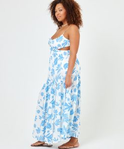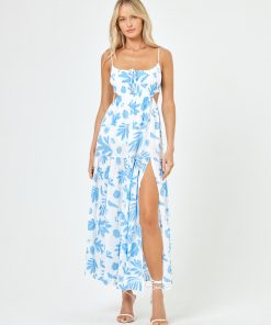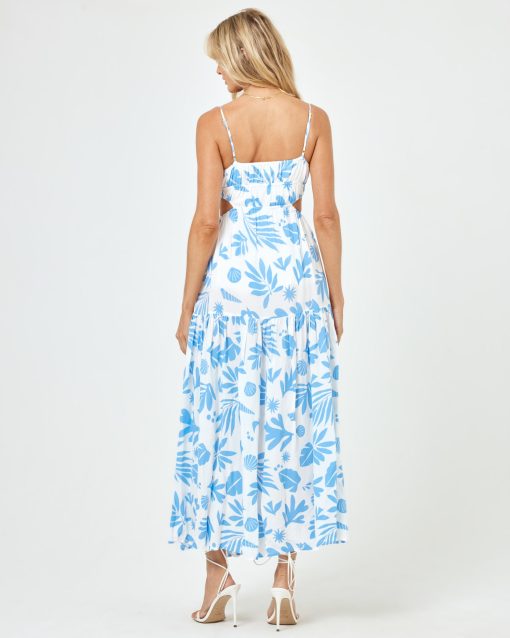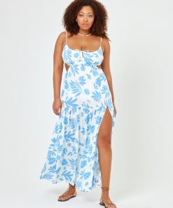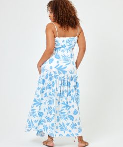 We re-worked our maxi dress silhouette and came up with the Sandra. This printed beauty has an elastic waist with side cutouts and a front tie with bead details. Our gorgeous new blue and white printed linen fabric will make this dress your go-to for your next beach vacay. Tiered Maxi Dress Leg Slit Adjustable Spaghetti Straps Adjustable Tie At Bust Elastic Under Bust Cutout At Waist 100% VISCOSE Like all delicates, shape, color and fit are best preserved if hand washed in cold water. Lay flat to dry. Style # SANDR24