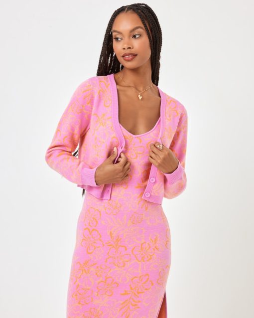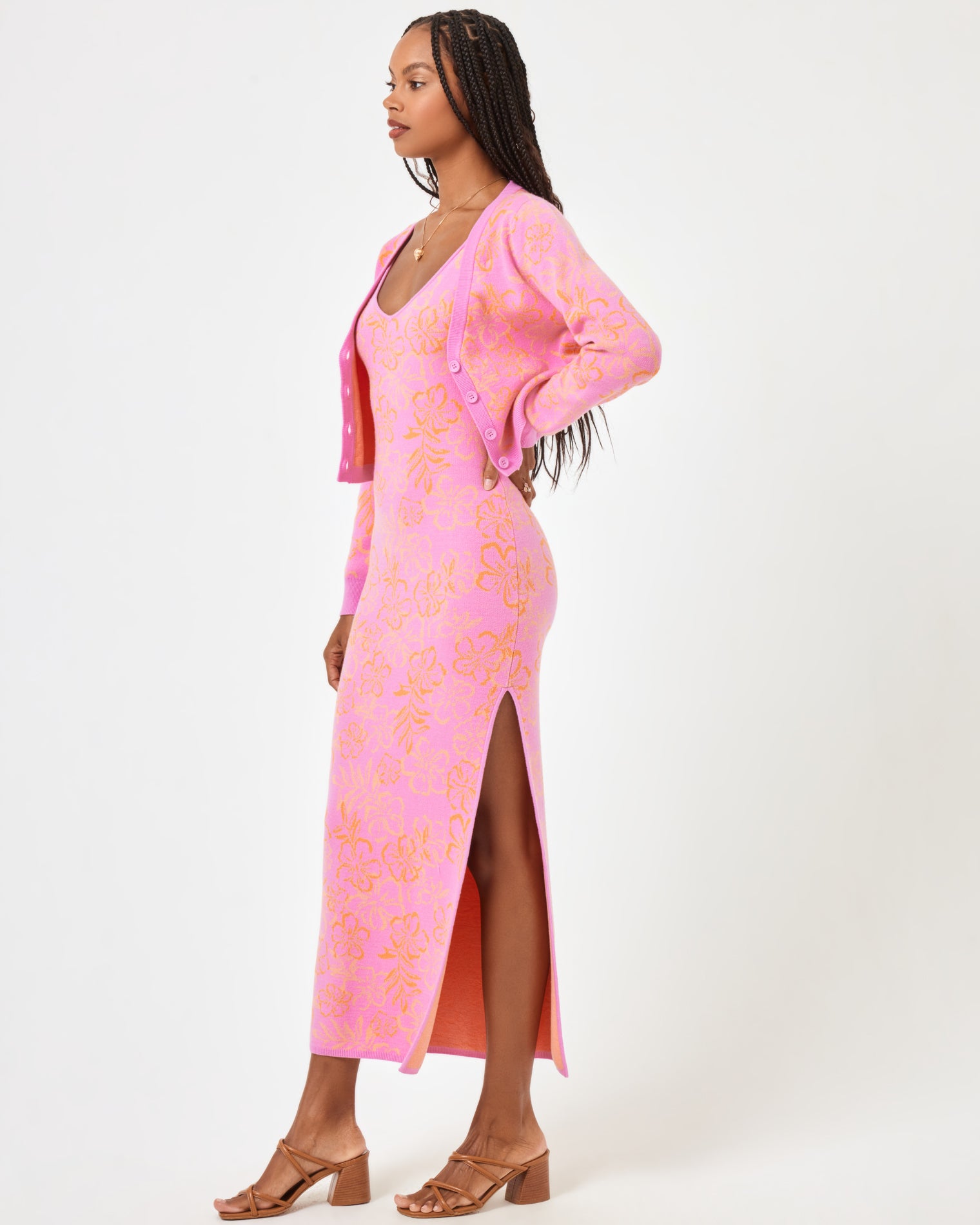 Button things up in the Spring Fling Sweater. This cropped v-neck cardigan is fitted and made from our substantial and luxurious jacquard knit fabric. Wear it on its own with denim or pair it with the matching dress for a coordinated set. V Neck Cardigan Cropped Fitted Button Down Four Buttons Jacquard Knit Size XS-XL 52% Rayon 28% Poly 20% Nylon Like all delicates, shape, color and fit are best preserved if hand washed in cold water. Lay flat to dry. Style# SPFSW24