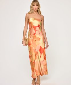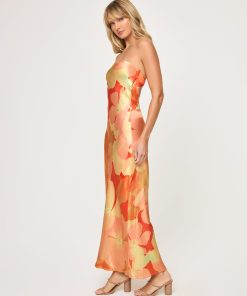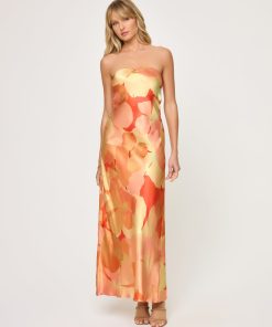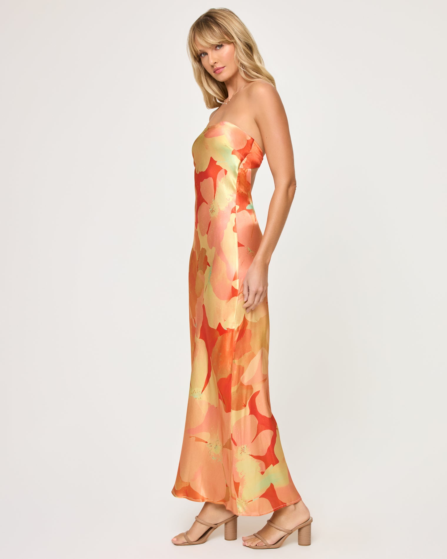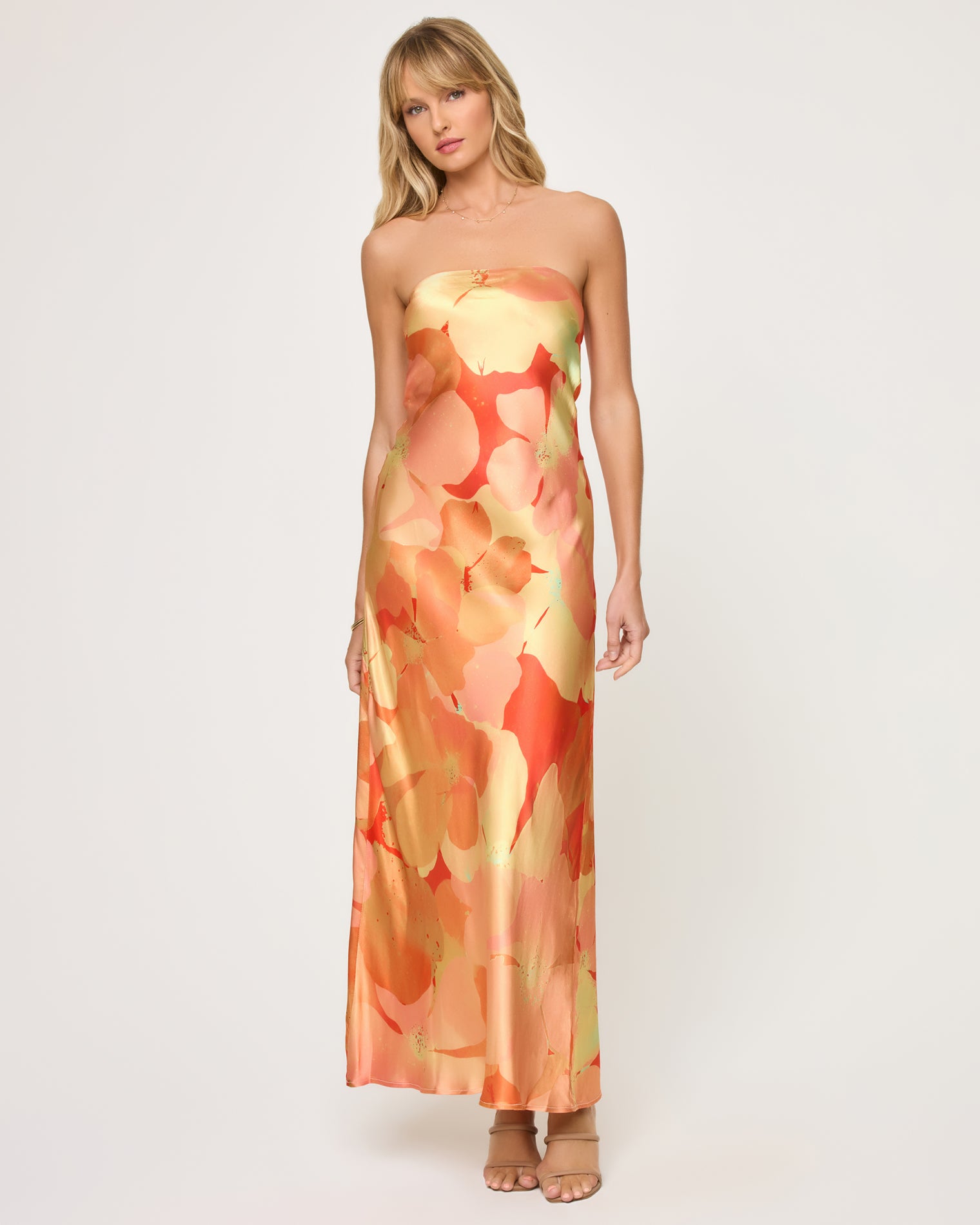 Give your neckline the attention it deserves in the strapless Spring in Love Dress. This midi has a low cut-out and elastic at the back. Our bold floral print adds a layer of sophistication making it perfect for a vacation or weekend getaway. Satin Strapless Ankle Length Dress Low Cutout at Back Elastic at Back Built-in Shelf Bra Size XS-XL Style # SILDR24