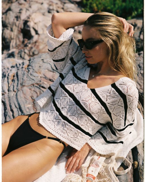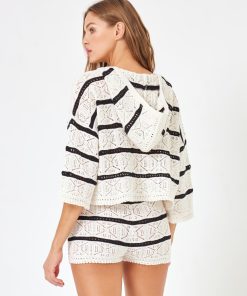 Crochet is here to stay and the Diamond Eyes Sweater does it right. The OG sold out and we re-issued our go-to favorite with stripes! This cropped pullover features a hoodie, v-neck and three-quarter length sleeves. Wear it with the matching knit shorts or your favorite denim cut-offs. Cropped Pullover Hoodie V Neckline 3/4 Sleeve Striped Diamond Eye Crochet Fabric 100% Cotton Size XS-XL Style # SDESW25