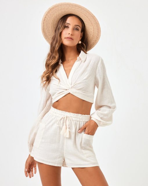 Throw on the Wish You Were Here Shorts for a casual look that can be dressed up or down. With a high-waist, relaxed fit and pockets at the hips, they look cute worn on their own or paired with the coordinating shorts. High Waist Tie Waistband Relaxed Fit Pockets At Hips Size XS-XL 100% Cotton Like all delicates, shape, color and fit are best preserved if hand washed in cold water. Lay flat to dry. Style # WUHSH24
