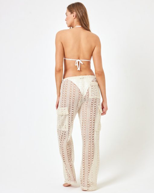 We all love a good cargo and the Sundown Pant is an elevated take on a classic look. Crafted from detailed Ibiza Lace fabric, these have a wide leg that features flap pockets on both thighs, a drawstring waist with tassels that allow you to wear these either high-waisted or low-waisted. Wide Leg Pant Pockets With Pocket Flaps On Both Thighs Drawstring Waist With Tassels Can Wear High Waist Or Low Waist Size XS-XL, 1X-3X 86% Polyester/14% Cotton Style # SNDPT24A Model Measurements: Daria, size S – Height 5’9.5”, Bust 34, Waist 24.5, Hips 36